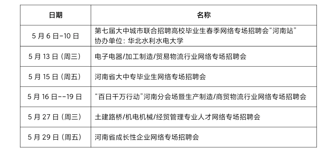 本次面向毕业生的专场招聘活动共有2场:5月6日至10日,河南省人才交流中心与华北水利水电大学在中国中原人才网联合举办了“第七届大中城市联合招聘高校毕业生春季网络专场招聘会‘河南站’”活动;5月15日,河南省大中专毕业生网络专场招聘会将在中国中原人才网举办,预计将有近200家用人单位携会计、人力资源、机械、电气、通信工程、计算机、物流、国际贸易、土木工程、化工、生物工程、英语、金融等多个专业岗位需求,迎接各专业毕业生开始崭新的职场生活。