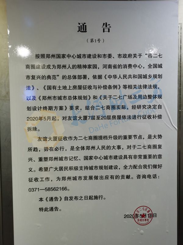 5月16日,郑州二七区德化解街道办事处发布通告,称经研究决定自2020年5月起,对友谊大厦7层至20层进行征收补偿拆除。