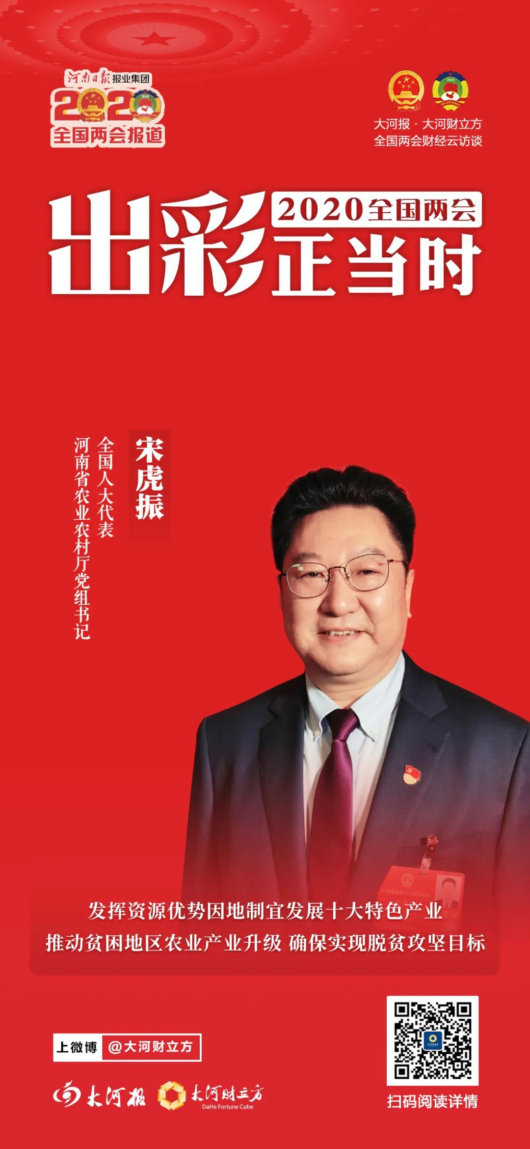 “今年是全面打赢脱贫攻坚战收官之年,我也更关注如何扎实推动农业产业升级、带贫主体升级和产业服务升级,为如期完成脱贫攻坚任务、巩固脱贫攻坚成果提供有力支撑。”今年两会期间,全国人大代表、河南省农业农村厅党组书记宋虎振向大河报·大河财立方记者表达了上述观点。