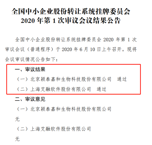 6月10日,新三板精选层挂牌委迎来“第一审”,首次审议的北京颖泰嘉和生物科技股份有限公司(以下简称颖泰生物)、上海艾融软件股份有限公司(以下简称艾融软件)2家公司均获无条件通过。从全国股转系统受理申请材料到审核通过,颖泰生物前后共经历了44天、艾融软件前后共经历了43天,创造了“精选层速度”。