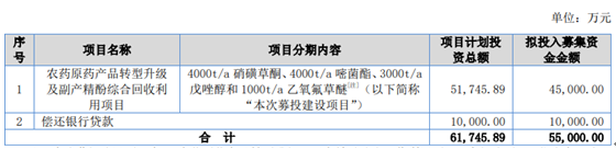 颖泰生物本次拟以不低于4.75 元/股,公开发行不超过1亿股,拟募集6.17亿元,募集资金将用于农药原药产品转型升级及副产精酚综合回收利用项目及偿还银行贷款。