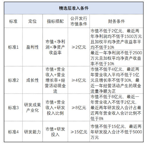 在精选层中,利润并不是唯一参考标准,它是从利润指标、收入增长指标、市值指标三者中选择,即上市企业满足其一即可入选。