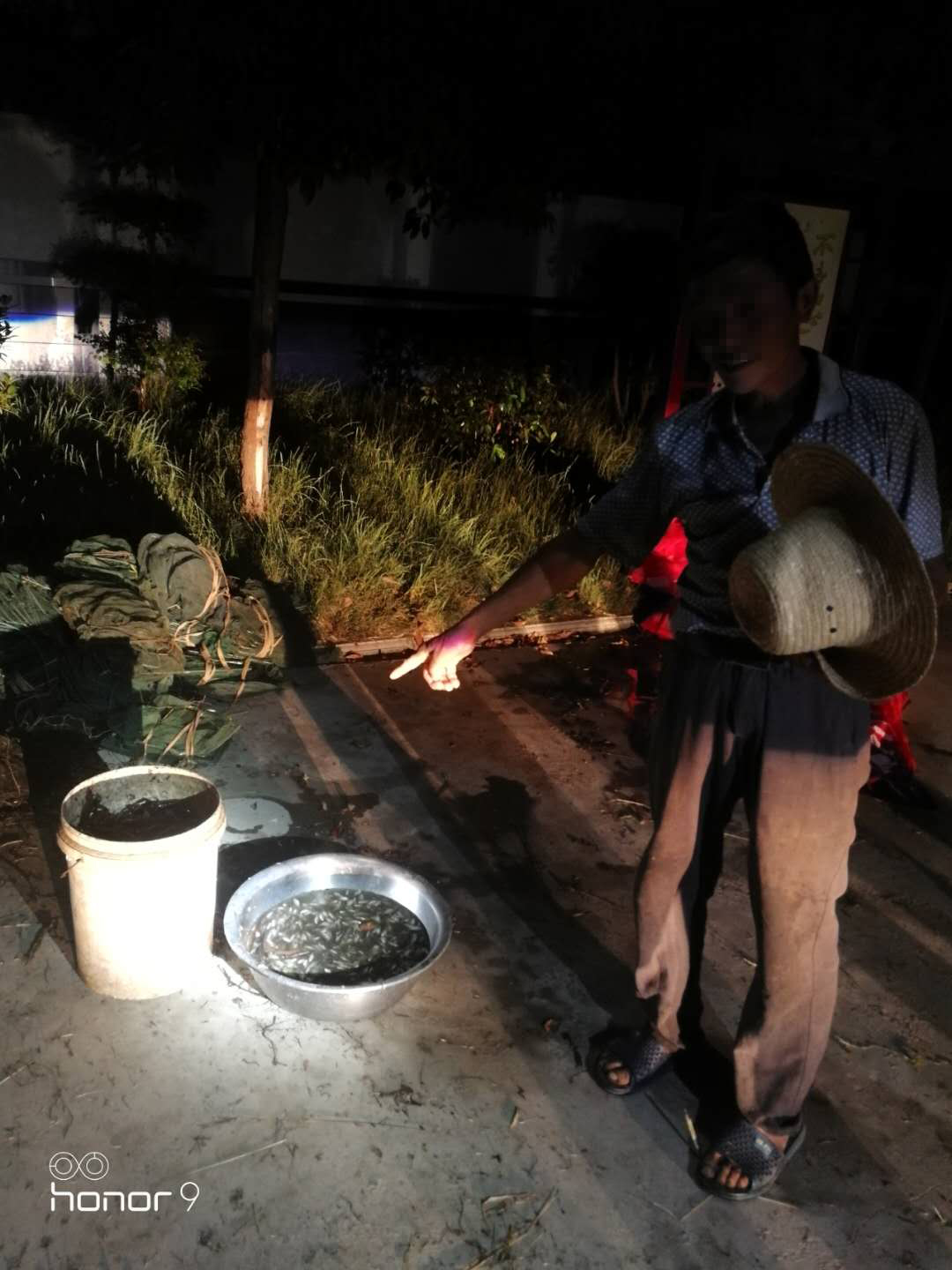 2020年6月7日晚11时许,邓州市公安局九龙派出所民警在开展夜间治安巡逻过程中,当巡至辖区姚营村南刁河段时,发现河边有灯光闪烁,一男子形迹可疑,于是上前盘查。发现男子正在河边下地笼逮鱼虾。