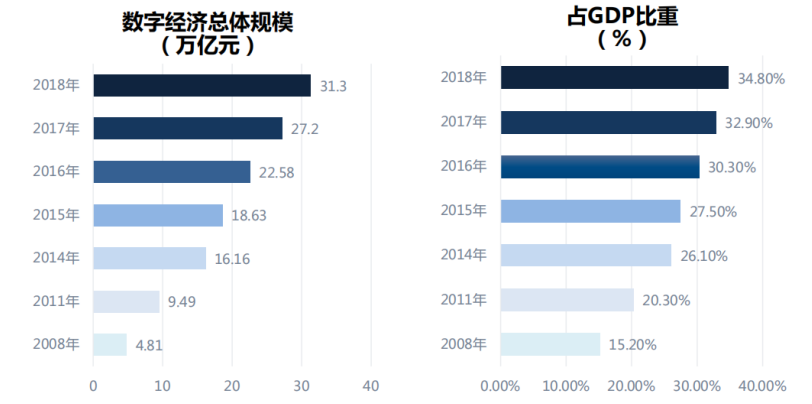据中国信息通信研究院统计,截至2018年,我国数字经济总量已达31.3万亿元,占GDP的比重达34.8%,对GDP的贡献率达67.9%。其中,产业数字化发展迅猛,成为数字经济增长的重要引擎;数字产业化增势平稳,占GDP比重稳定。