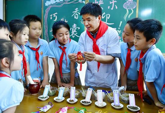 安徽中医药大学教师齐亚军进校园,教小学生制作养生中药香囊。