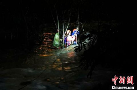此时,暴雨仍在下,水位不停上涨,且天色渐黑,营救刻不容缓。消防指挥员决定采用绳索横渡的方式进行救援,先将绳索抛投至被困者身边,指导被困人员利用身旁树木将绳索固定,消防员在岸边协力拉紧绳索,搭建起横渡救援绳索系统。准备就绪,消防员通过绳索携带救生衣、腰带、挂钩等器材横渡到对岸,帮助被困者做好保护措施,利用牵引绳依次将被困者通过横渡系统拉至到岸边安全地带。经过2个小时努力,4名被困人员被全部救出。