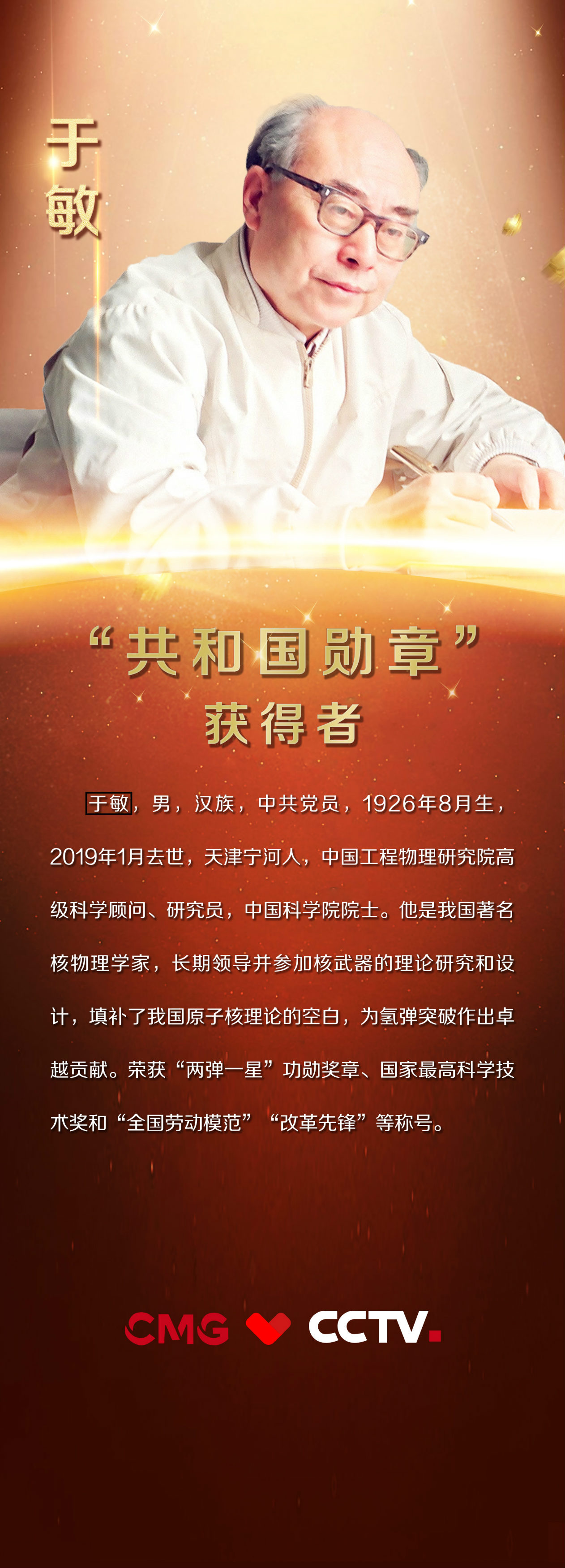 于敏,男,汉族,中共党员,1926年8月生,2019年1月去世,天津宁河人,中国工程物理研究院高级科学顾问、研究员,中国科学院院士。他是我国著名核物理学家,长期领导并参加核武器的理论研究和设计,填补了我国原子核理论的空白,为氢弹突破作出卓越贡献。荣获“两弹一星”功勋奖章、国家最高科学技术奖和“全国劳动模范”“改革先锋”等称号。