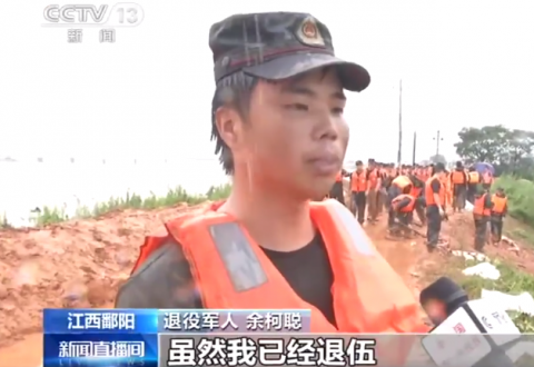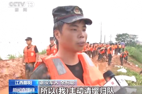 退役军人余柯聪,得知曾服役的部队在圩堤抗洪抢险,自行乘车50分钟从家里赶来,加入到抗洪抢险队伍之中!