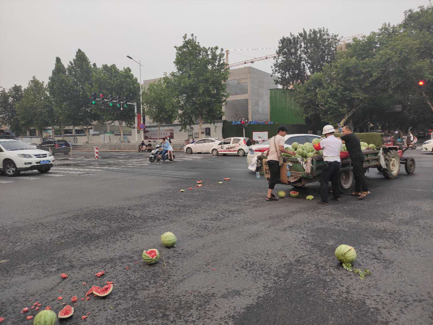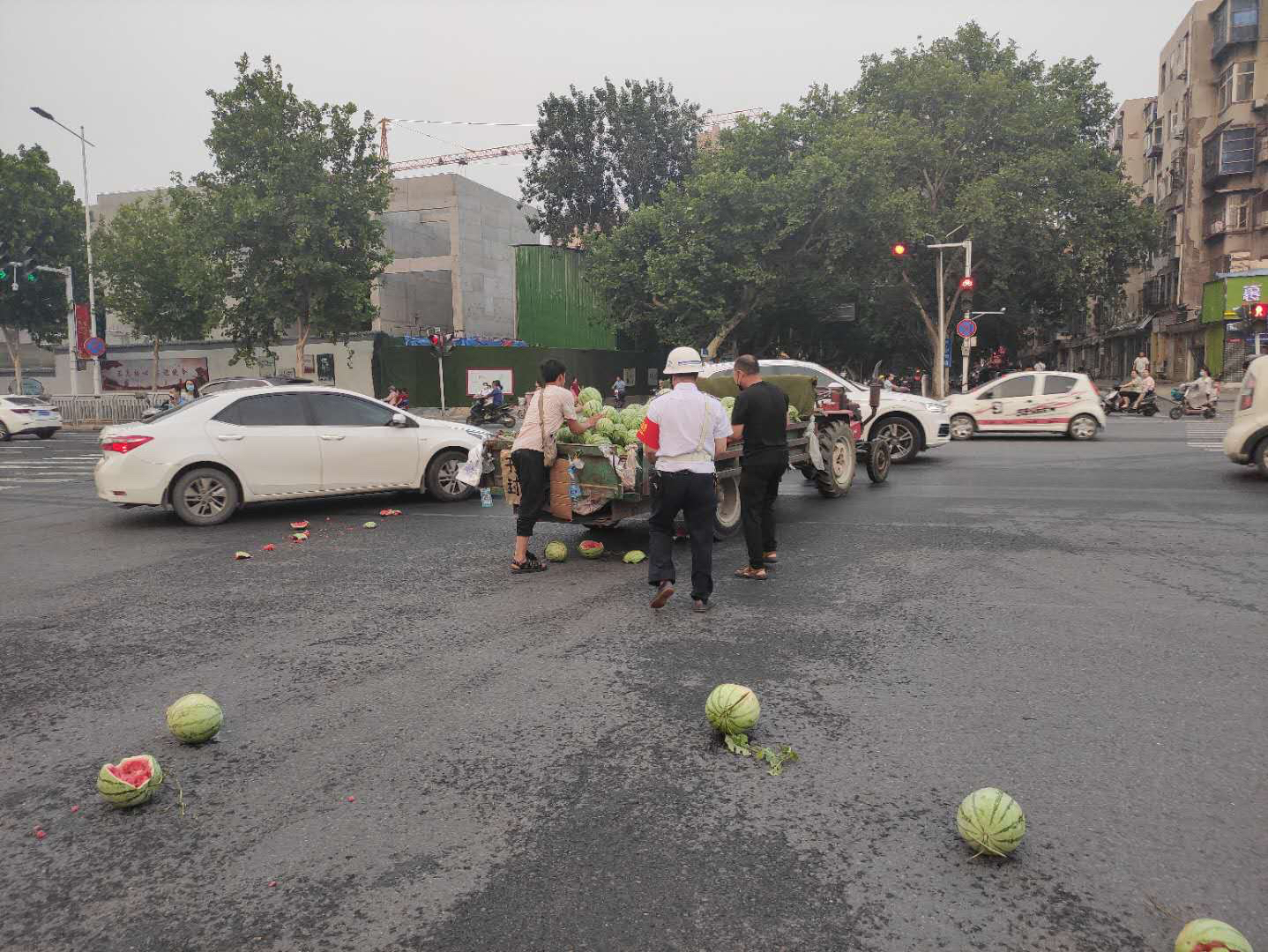 昨天下午6时许,来自开封县范村乡刘寨村民组的瓜农姚亚军,驾驶一辆满载西瓜的农用车,行至郑州市伊河路与秦岭路交叉口时,突然听到有人大声冲他叫喊,他赶紧扭脸查看,发现自己车上的西瓜掉了许多,有的已经摔碎……