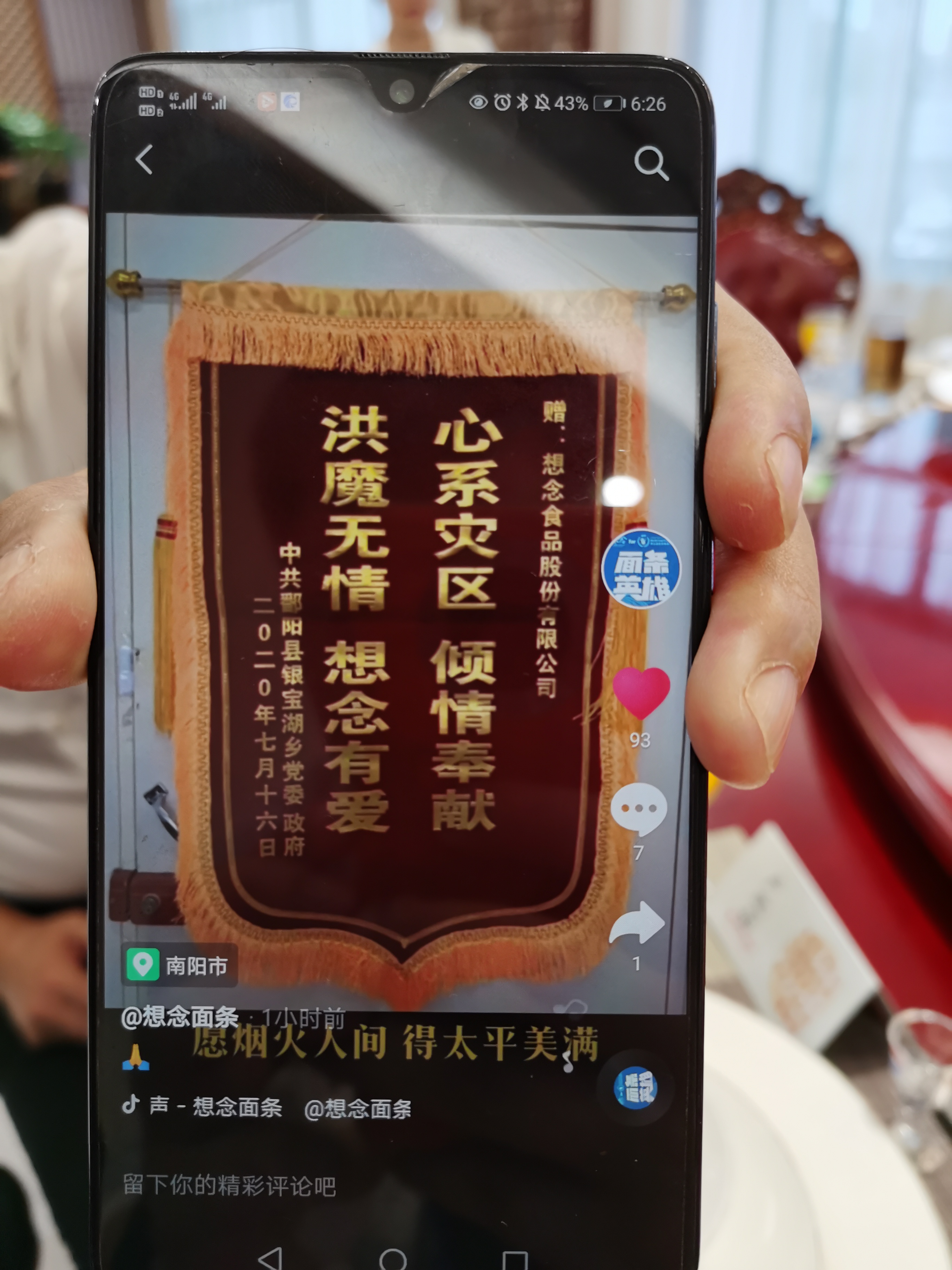 大河网讯 (记者 宋向乐)7月22日,一面印有“心系灾区 倾情奉献 洪魔无情 想念有爱”的锦旗寄到镇平县想念食品公司,落款是中共鄱阳县银宝湖乡党委、政府。这面锦旗印证着想念食品的社会担当和责任——一周前,想念食品的1000余件挂面疾驰支援洪灾严重的江西鄱阳县。