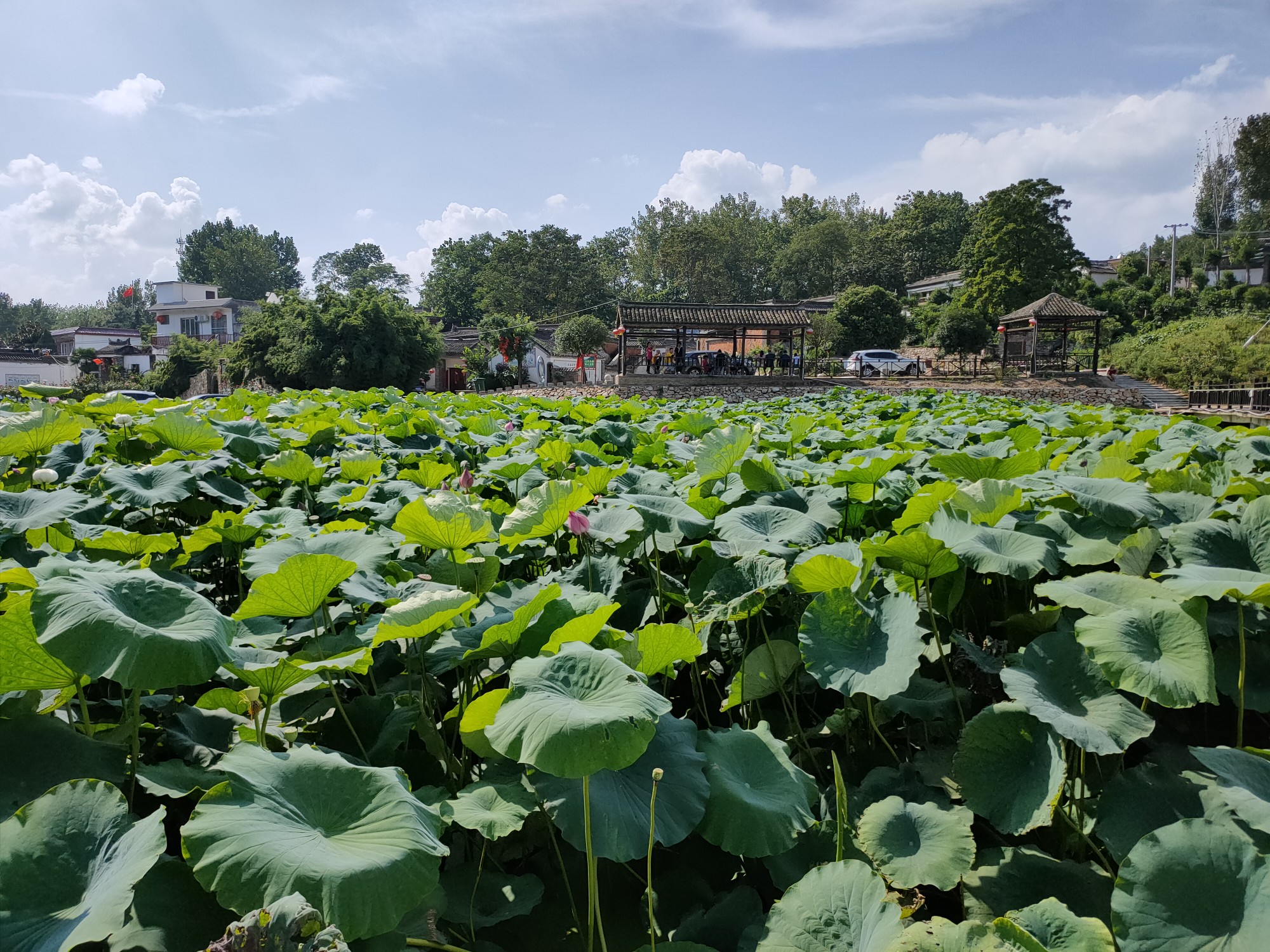 在村头有一个坑塘,经过治理成了荷塘美景,客人可沿着木桥进入荷塘深处,木桥尽头则是一个亭子,在亭子里坐下,抬头是巍巍青山,低头是荷叶田田。游客不由得感叹道:磨沟村,真美!