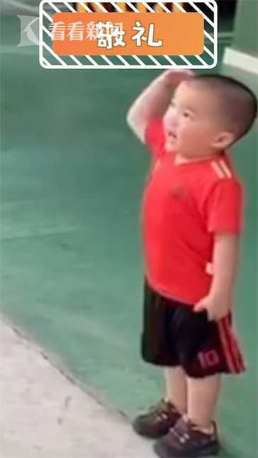 “稍息、立正、敬礼、礼毕”,小小的个头,稚嫩的脸庞,但这位萌娃每个动作都有模有样,全程还自带音效。