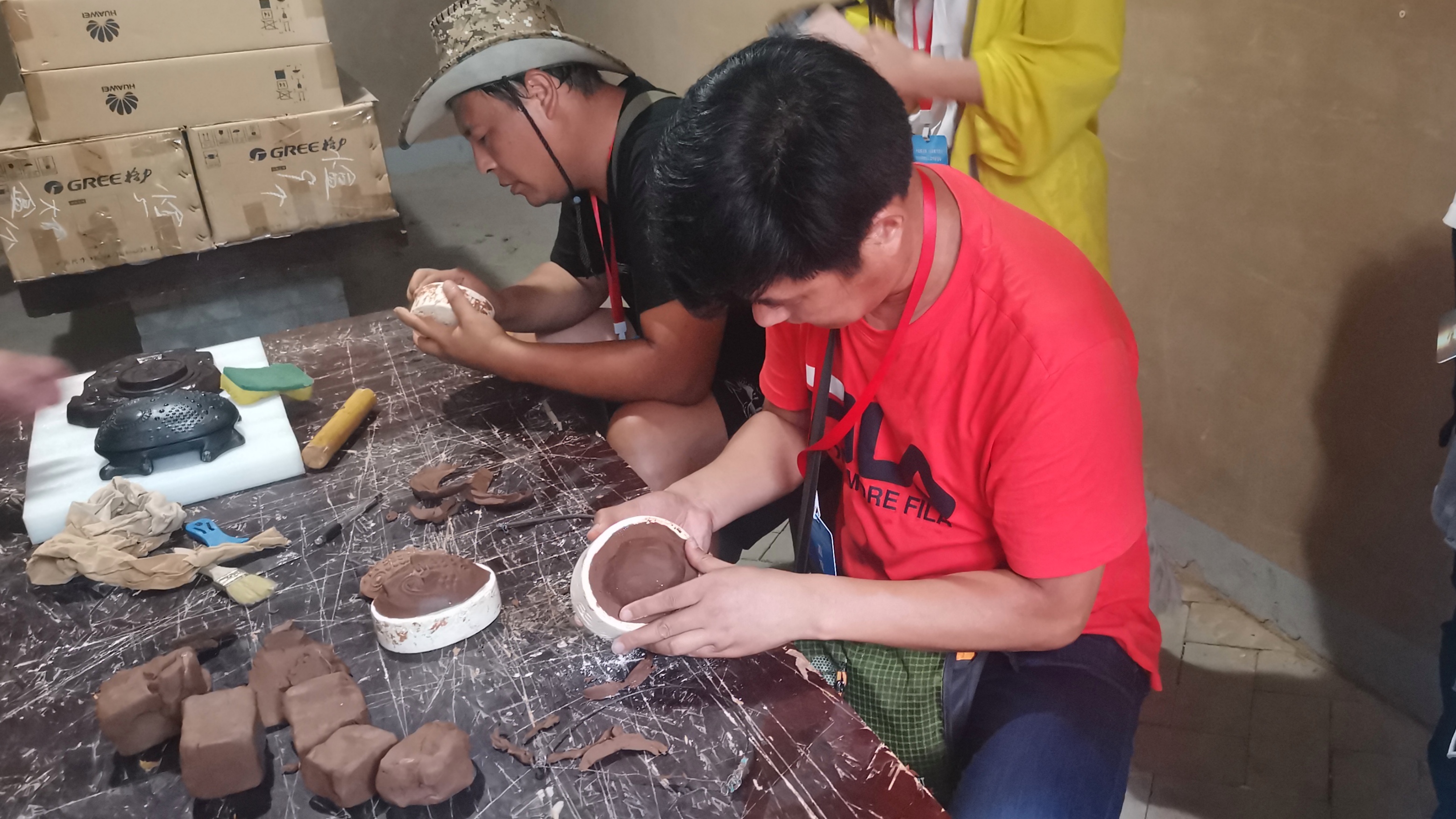 一把黄河泥,经过拣选、捣碎、过筛、澄滤、配料、糅合、陈放等几十道工序,摇身一变成了精美的“澄泥砚”,这是坑院内的非遗展示项目之一,吸引了采风团一行驻足拍照、体验。
