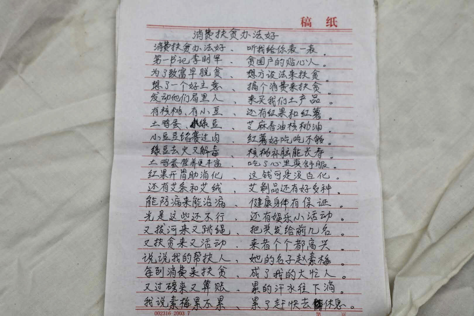 “扶贫政策的春风吹真是吹进了我们心坎里,2018年,我们家脱了贫、摘了帽,感谢党和国家,我决定把感谢的话以及生活的变化写进诗歌里。”老杨说,他只有小学文化,遇到不会写的字,就去问村里的学生,村里发的扶贫政策宣传册,他也都留着,不时拿出来翻看学习。