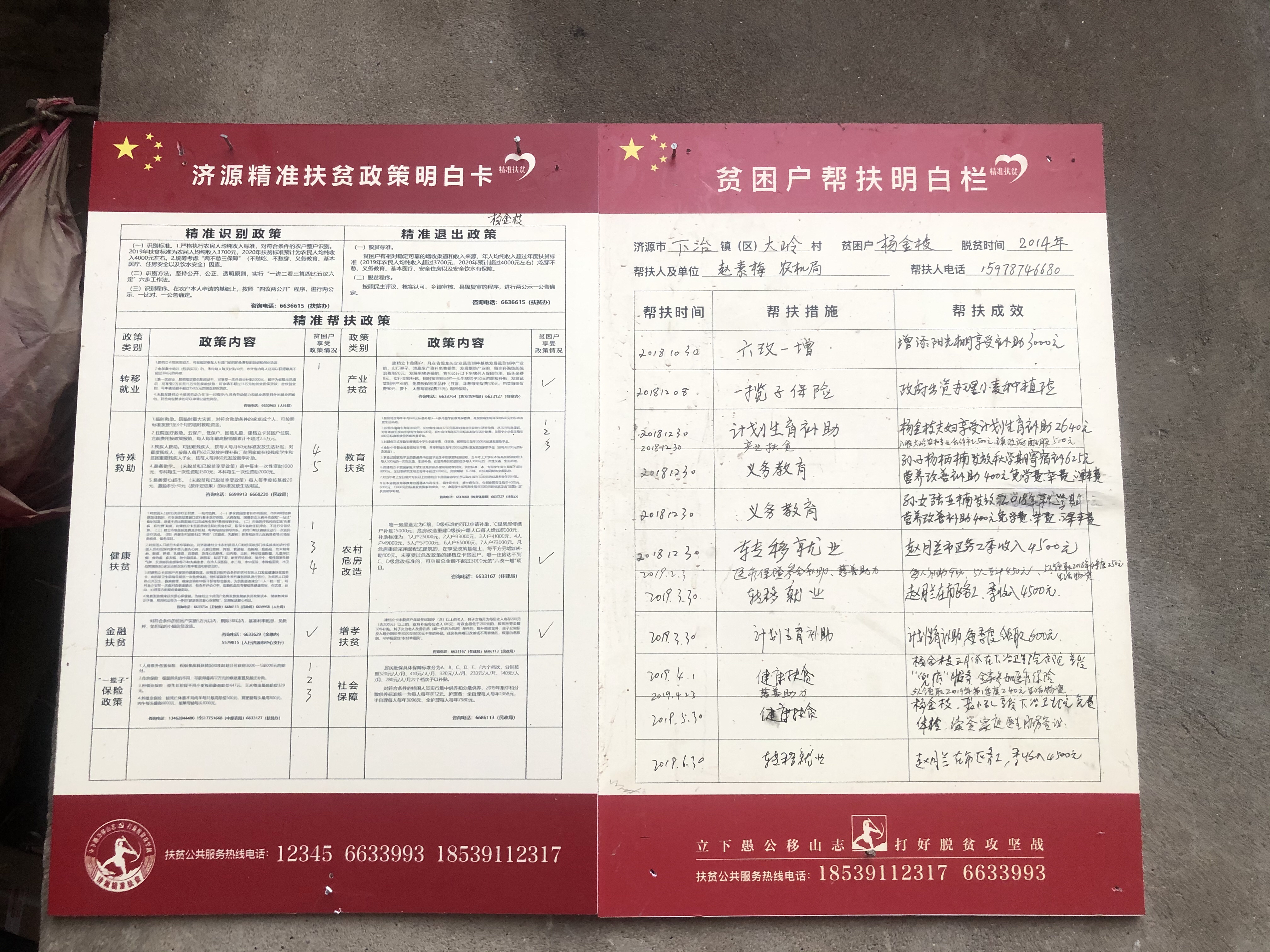 增孝关爱,子女为杨金枝、聂小乱每人每月转账200元,政府补贴100元,共计600元;转移就业,杨金枝参加扶贫公益岗,每月900元;慈善助力,领取2020年第一季度250元生活物资……站在贫困户帮扶明白栏前,老杨脸上的皱纹笑成了花。“立下愚公移山志,打好脱贫攻坚战。”济源当地制作的宣传语,正通过大家不断的努力变为现实。