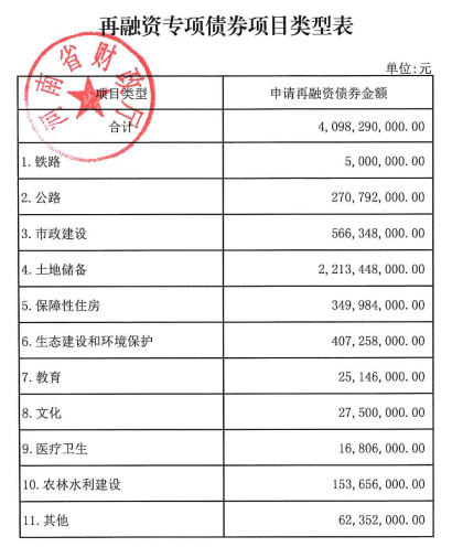 40.98亿元再融资专项债券,用于铁路、公路、市政建设、粮油物质储备、社会保障、保障性住房等11个项目;