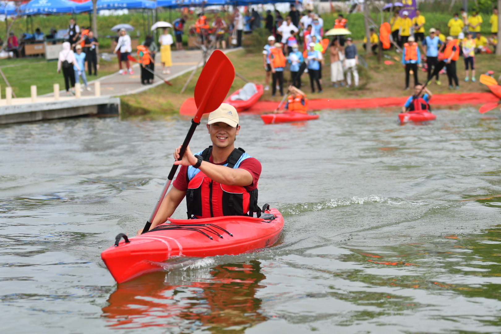 这条长800米的赛道让筹备该赛事的焦作市社会体育指导员协会会长毛庆引以为豪。他告诉记者,水上基地建设前期,焦作市体育局邀请专家对大沙河堤顶路况、河道宽度、水位深度进行科学分析、论证,从供市民休闲健身、举办高水平专业体育赛事活动、后期经济效益等方面进行论证和选址,最终确定了这片区域。经过建设,这条赛道不仅可以承办国家级水上运动专业赛事,而且在平时可以满足广大市民进行水上运动的需求,还可以进行龙舟比赛。