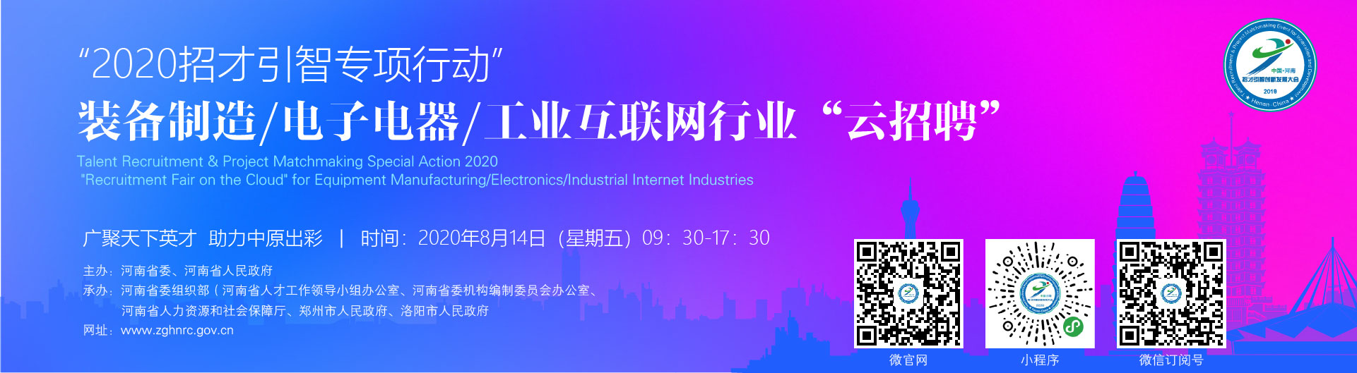 大河网讯 (记者 刘晓明)8月11日,大河网记者从河南省人力资源和社会保障厅获悉,8月14日9时30分—17时30分, 中国·河南招才引智创新发展大会“2020招才引智专项行动”装备制造/电子电器/工业互联网行业“云招聘”活动将在大会官网进行。