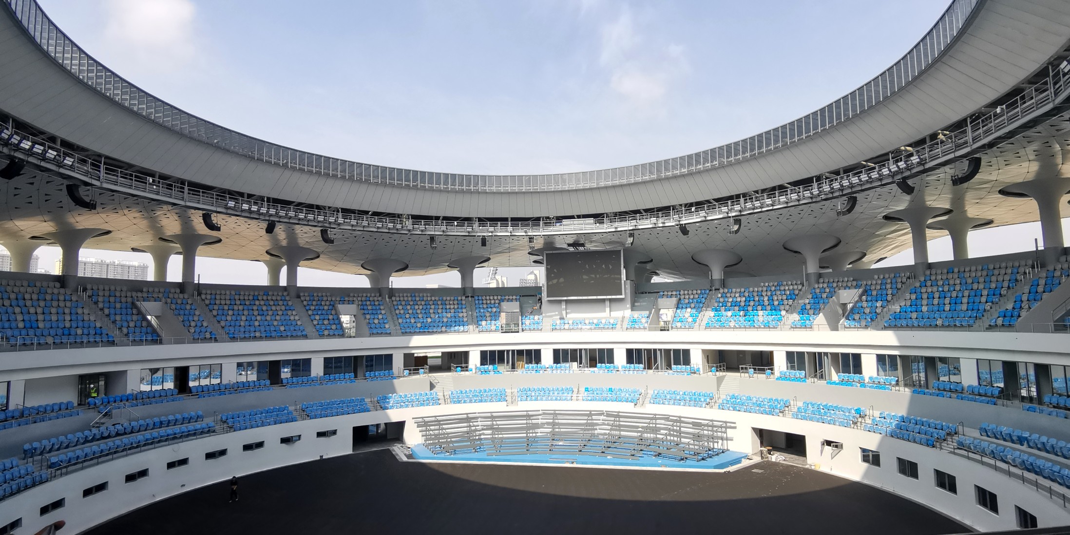 主场馆的设计有“生命运动之树”的意义,走进场馆内可以看到:3层是看台层,2层是VIP贵宾层,1层是技术官员区、运动员区和媒体区域,且独立分区,蓝灰相间的座椅,两块大屏幕,施工人员正在做收尾工作。