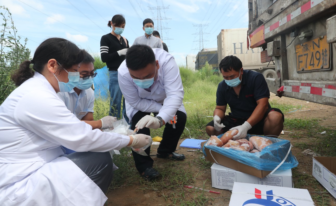 8月21日上午10点,中牟县万邦生鲜市场西停车广场上,近十辆生鲜冷冻车静静地在等候。 两名穿白大褂的工作人员正在逐车提取样本,他们是中牟县市场监管局工作人民,最近两个月,这个停车场就是他们的工作场地,内容就是抽检进口的冷冻产品。
