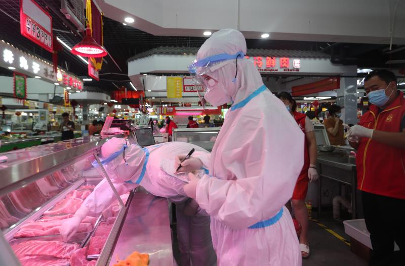 同时,全省各级疫情防控领导机构协调市场监管、商务、交通运输、卫生健康部门组成检查组,以农贸市场、大中型商场超市、冷库以及冷冻冷藏肉品使用量大的餐饮单位为重点场所,以生鲜、冷冻畜禽肉类和海鲜水产品为重点品种开展排查。重点检查经营单位是否取得合法的主体资质、货品来源是否合法、有无检验检疫证明、是否有产地合格证明、是否建立进销货台账、是否有过期冷冻冷藏食品等,同时,对相关产品的从业人员和经营环境开展核酸检测工作,对商超、农贸市场等经营场所的相关产品、操作台、运输车辆等进行抽样。全面排查食品安全风险隐患。