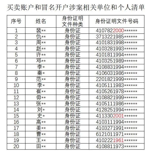 8月26日,为使社会公众清楚认识非法买卖、出租、出借账户的法律责任,加大对买卖账户等违规行为的惩戒力度,郑州警方联合中国人民银行郑州中心支行、郑州移动、郑州联通、郑州电信公布了首批230名涉嫌买卖账户、冒名开户相关单位和个人及电信网络新型违法犯罪案件涉案账户人员的信息,并予以惩戒。
