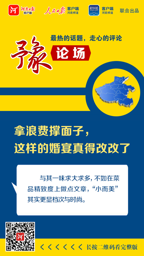 只有遏制婚宴浪费现象,餐饮节约的美德才能在全社会真正发扬光大。虽说生活需要仪式感,一生一次的婚礼更要盛大完美,但“剩宴”不等于盛宴。俗话说,“物以稀为贵”,以往,只有王公贵族才能“玉粒金莼噎满喉”,如今人们物质条件普遍好了,办几场“剩宴”也体现不出“面子”多光鲜,“打肿脸充胖子”,为了一场炫耀性婚宴,婚后举债度日更不可取,观念上要逐步转变。节俭不代表新人小气,浪费才没有面子,现代人生活品质提高后,吃的量越来越少,这也是不争的事实,与其一味求大求多,不如在菜品精致度上做点文章,“小而美”其实更显档次与时尚。