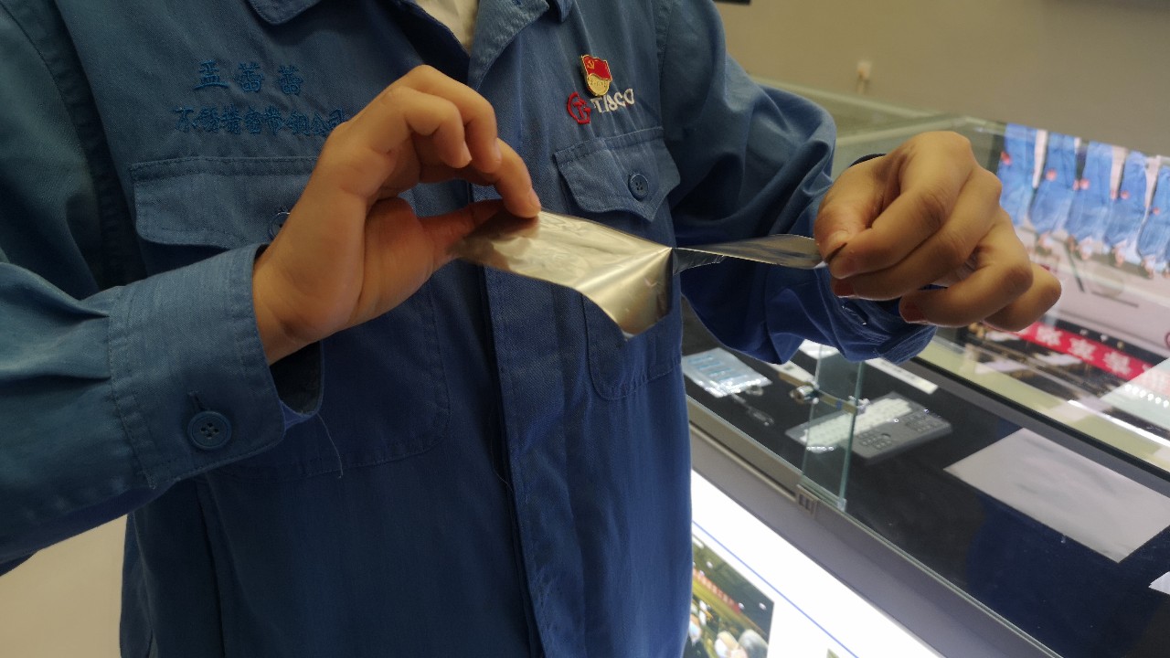 那么如此“脆弱”的不锈钢有什么用途呢?工作人员表示,因其具备优异的强度、精度、表面光洁度等性能,被广泛应用于航空航天、石油化工、汽车、电子、家电、计算机等高精尖端设备制造等行业。“因为它有强大的耐腐蚀、抗氧化、耐热等特点,可以用来做太阳能光伏发电基板,或者锂电池的包裹层,这两年比较火的折叠触屏手机也需要它。”
