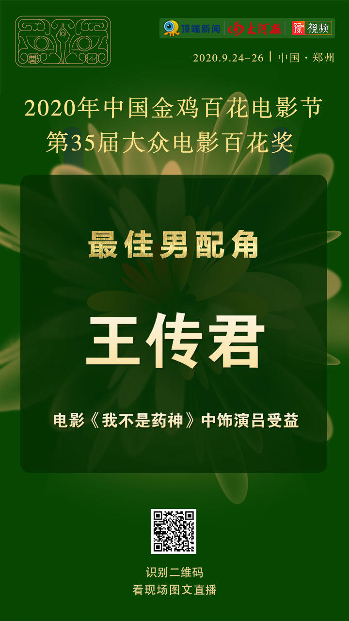 王传君获奖感言:先感谢在疫情之下每一个人 因为只有这些人的努力让我们才有这个机会 要感谢主办方 组委会 感谢评委 感谢《我不是药神》的伙伴们 爱你们 中国电影可以百花齐放,让我茁壮成长,我们也会继续努力的!