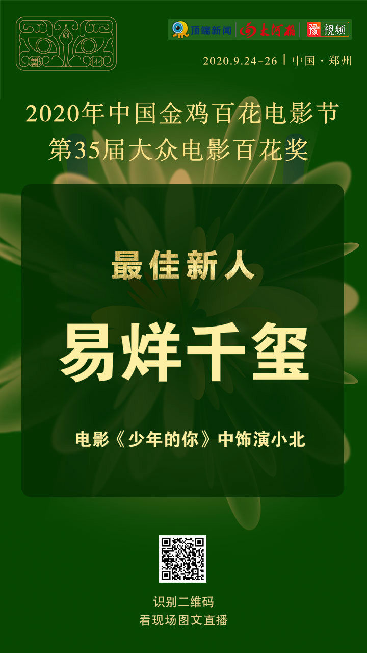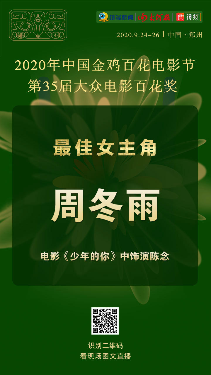 我特别想用一句话来表达此刻的心情:郑州真中!感谢百花奖,感谢每一位评委,感谢每一位观众。感谢导演和所有《少年的你》剧组的工作人员。很多人说我只能演中学生,如果观众喜欢的话,小学生我也能演。最后想说的是,疫情来临我过的特别踏实,也所有向疫情付出努力的人,向你们致敬!
