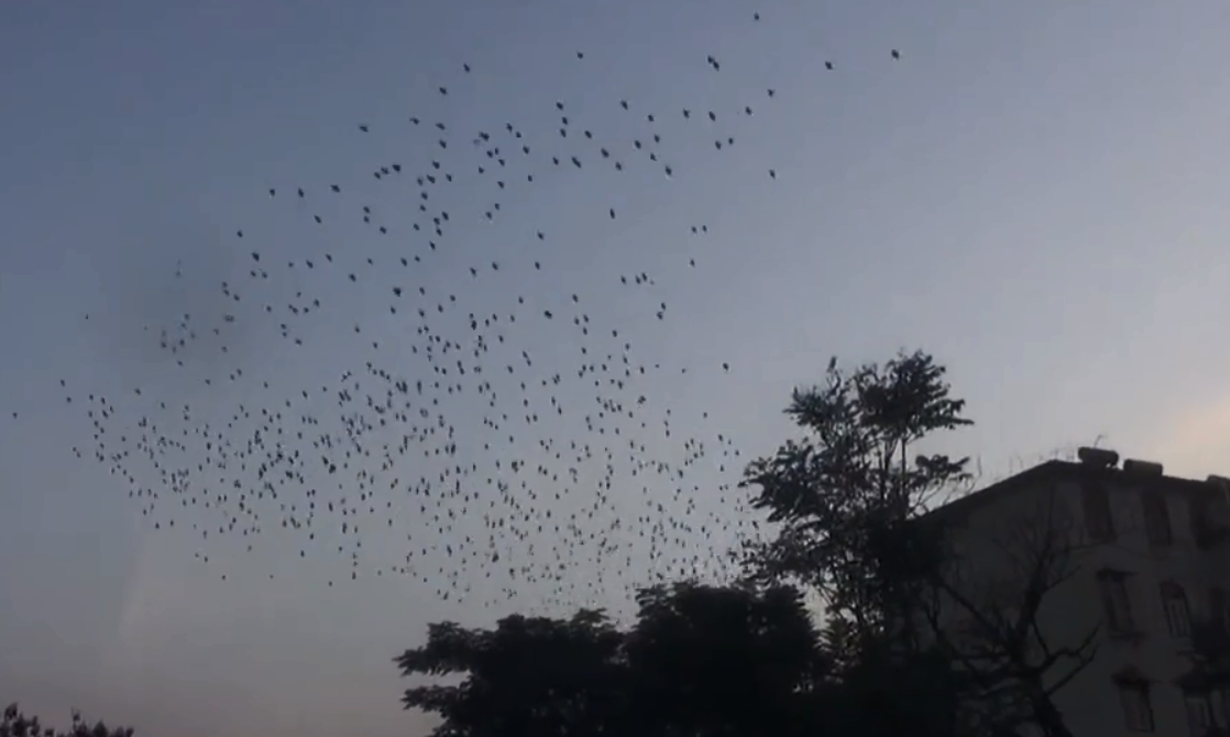 在市民拍摄的视频中记者看到,数以千计的灰椋在空中不断盘旋,时而高飞、是而回落,让不少路过的学生和市民驻足观看、拍摄。而附近居民也介绍,这个鸟群不仅在附近盘旋,有些更是在附近的树上安了家。