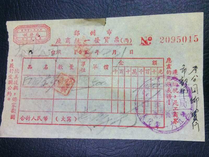 郑州市税务局将座商统一发货票,印上了“遵章纳税,是工商界应尽的光荣义务!抗美援朝,保家卫国,履行爱国公约。”