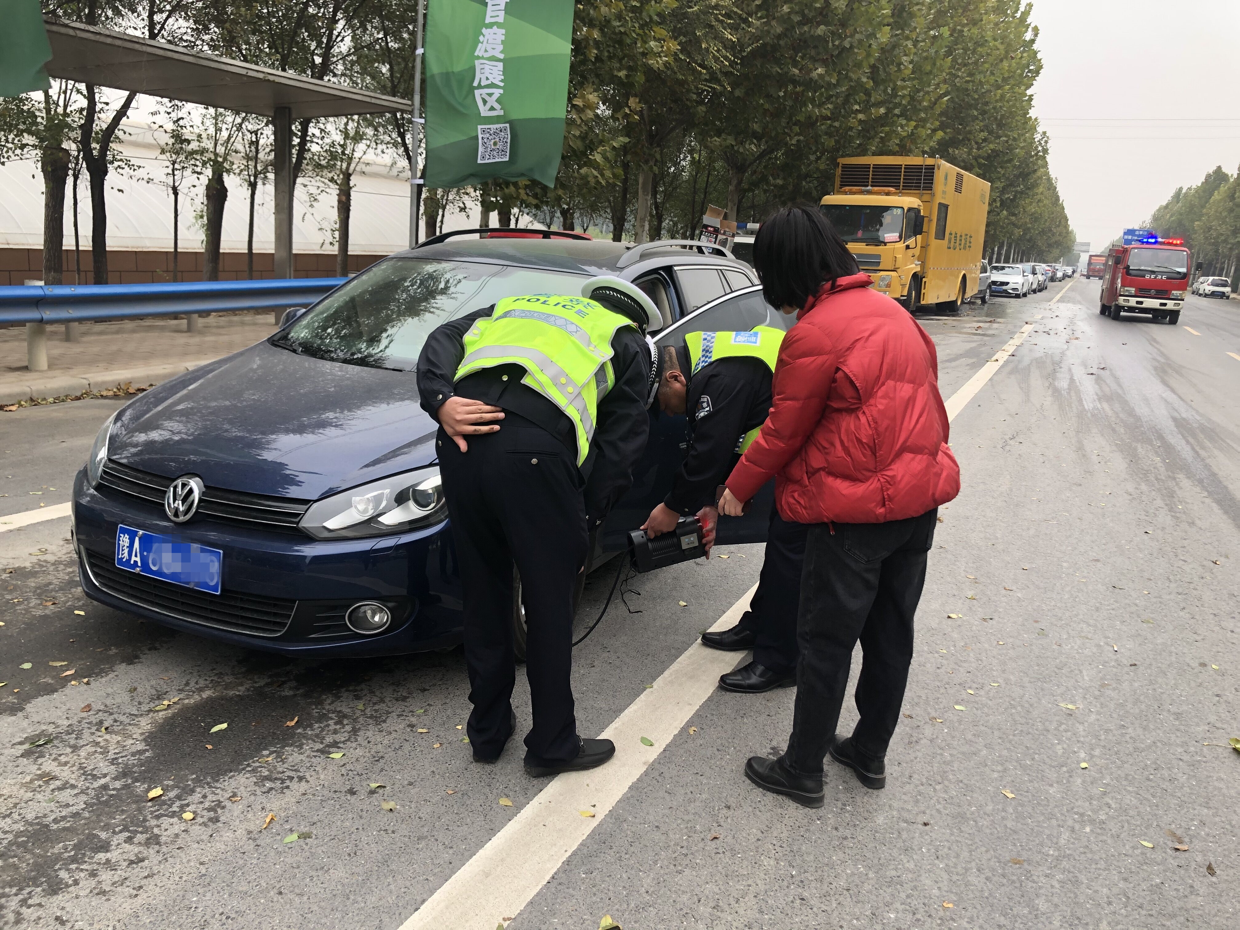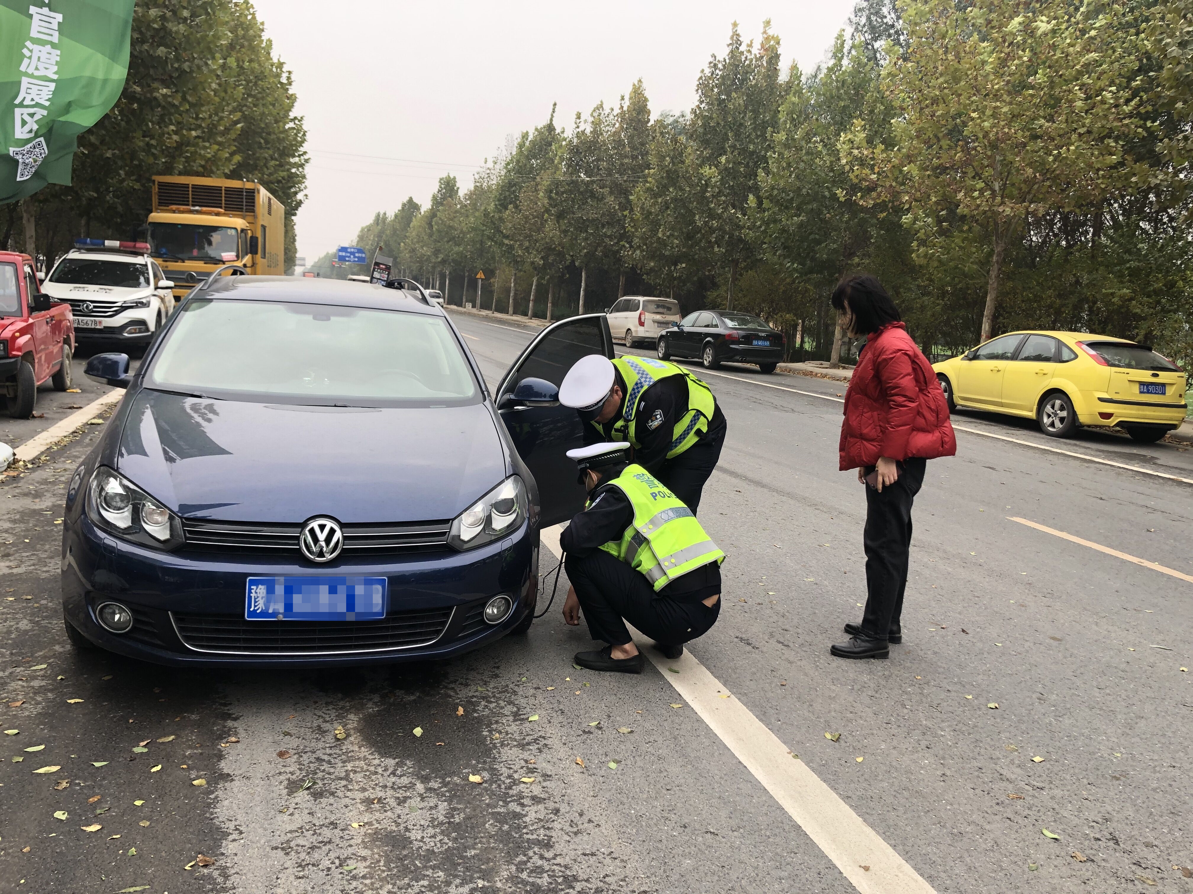 10月27日上午,中牟县交警大队五中队中队长吴树林、民警周喜亮等人根据大队的统一安排部署,在位于官渡镇韩潘路乡谣农场内举行的郑州市农业博览会附近维护交通秩序。上午11点18分,一神色慌张的女司机跑来求助说:“警察同志,我的车胎没气了,能帮忙看看吗?”