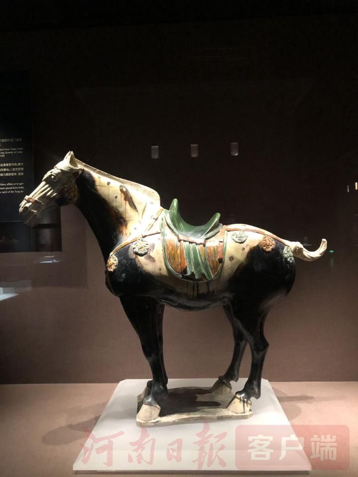 “龙种神驹,四蹄踏雪”。作为洛阳博物馆的“镇馆之宝”之一,三彩黑釉马头颈上昂,四足停立。“宝马”通体黑色,唯马面、鬃、背、尾、蹄为白色,间施酱黄色花斑,马鞍鞯为绿、黄、白三色相间,背垫以褐色釉革带为饰,在唐三彩艺术中实属罕见,为全国仅有的两个三彩黑釉马之一。