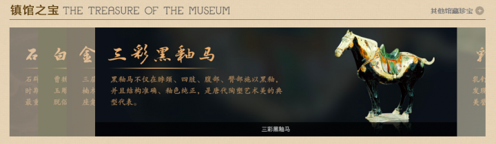 这匹于洛阳出土“宝马”在色泽、质感及姿态神韵均属唐三彩艺术中的上乘佳品,达到了力与美和谐统一的艺术效果。华丽的装饰与黑色马身相配,以完美的造型和高贵的气质,体现出泱泱大唐的帝国风范和古代工匠极高的艺术水准,反映了唐朝对美的理解与感悟,成功诠释了古典现实主义艺术的真谛。