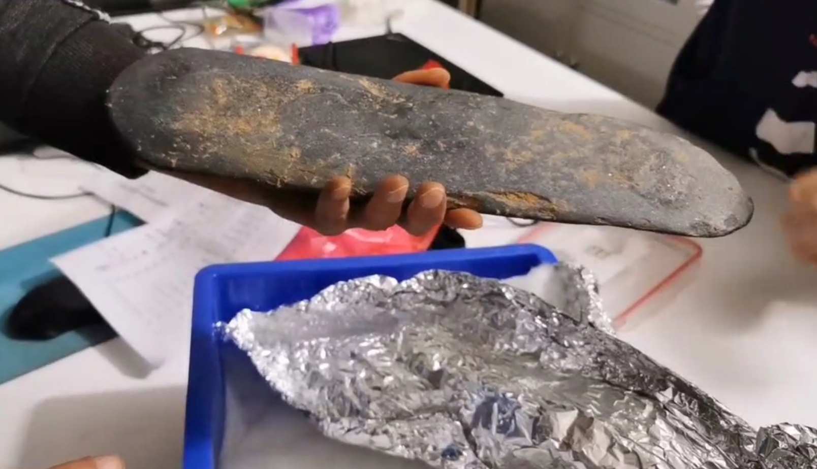 材料精美的一个石斧头,但是制作精良并没有使用痕迹,还有尺寸仅有两厘米左右的小石凿,功能可能类似于现在的刻刀。