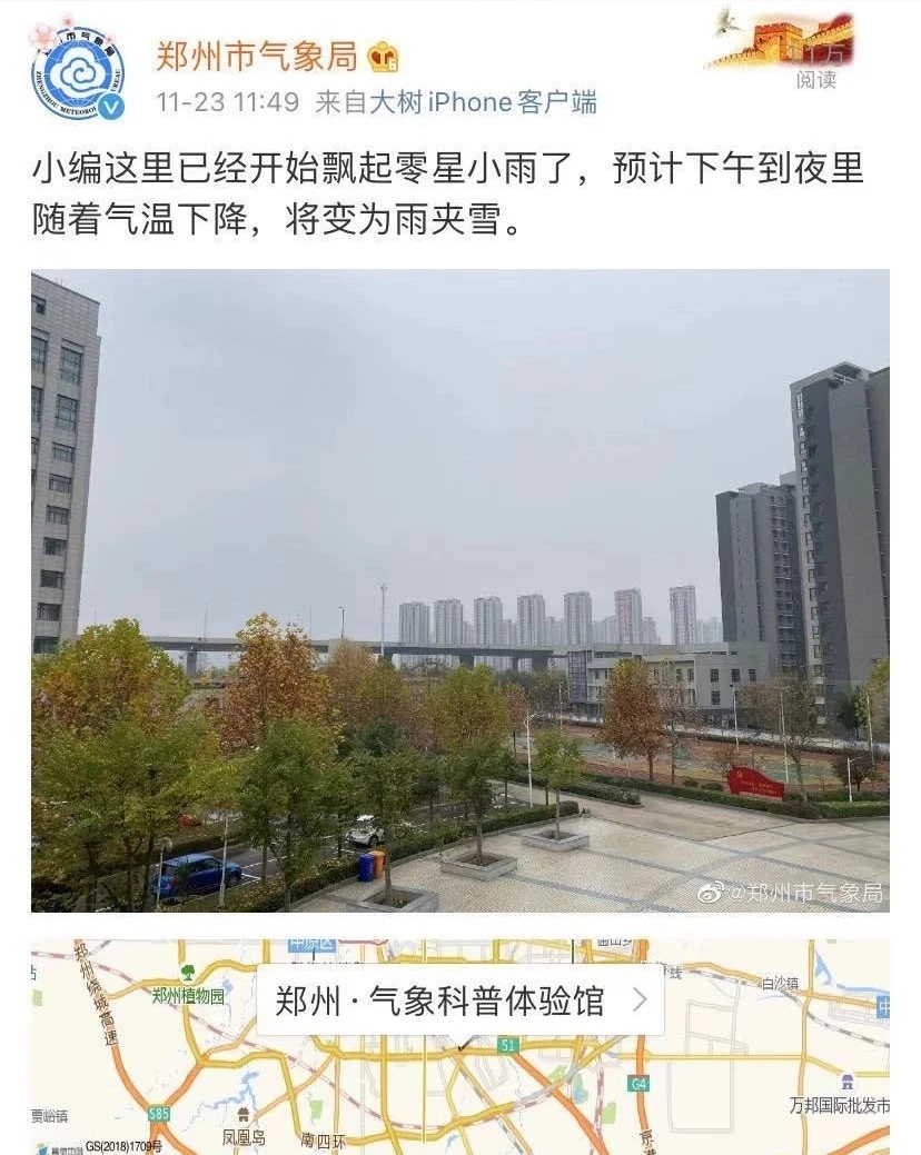 大河网讯(记者 莫韶华 通讯员 戴瑛)11月23日11时,郑州气象台发布预报称,今天下午到夜里,小雨夹雪转多云,最高气温4℃~5℃,最低气温-1℃~0℃。为此,好多朋友等着看2020年郑州的第一场雪,可结果却大失所望!郑州到底下雪了吗?