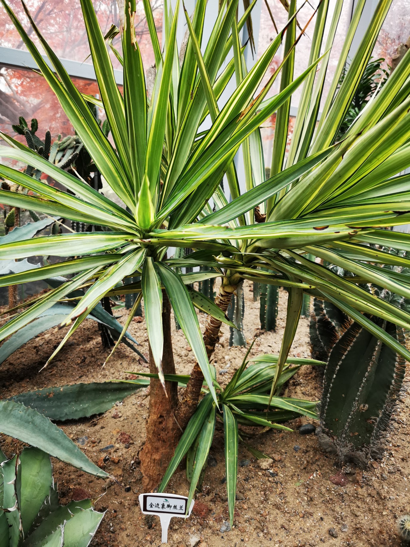 稻草人,则是引自墨西哥,又叫树丝兰。生长较慢,高可达10多米,叶细薄,灰绿色,叶披角质层,边缘有白色丝状纤维。干枯的旧叶不脱落,常年累积,犹如农田中的稻草人一般。金边象脚丝兰,常年浓绿,基部肥大,易分枝,主茎可高达10余米。叶有一层较厚的角质层和蜡被,能减少蒸发和御寒,坚挺直立,旋叠于茎顶,叶尖具针刺。花芳香,白色至青紫色,悬挂于直立的圆锥花序上。金边象脚丝兰株形规整,茎干粗壮,叶片坚挺翠绿,极富阳刚、正直之气。
