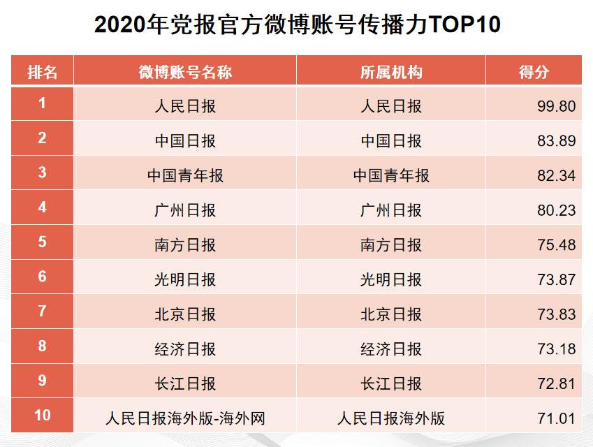 综合微博粉丝、发文量及互动情况,党报微博传播力排名前十的账号如图所示。