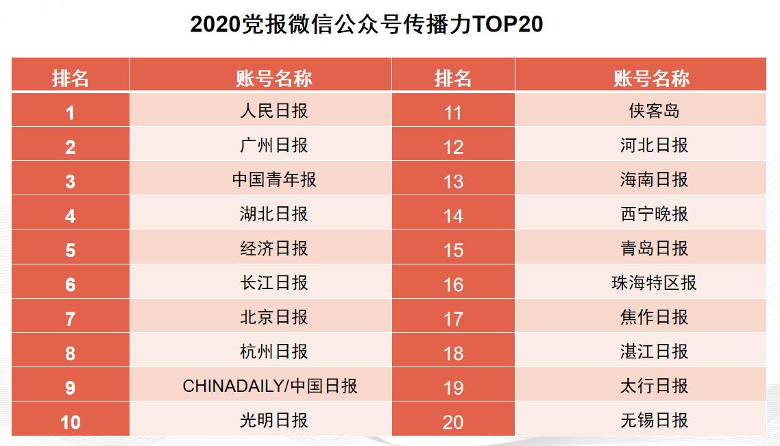 微信传播力前20的微信公众号中,有中央级党报微信6个,省级4个,地市级10个。其中地市级党报微信公众号增加了2个。曾经处于疫情中心区的湖北日报、长江日报的微信公众号进入前十。