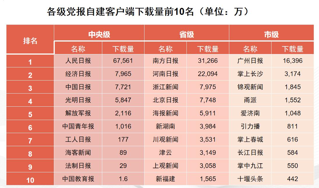 四、党报自有客户端的下载量大幅增长,地市级党报增长超3.5倍。