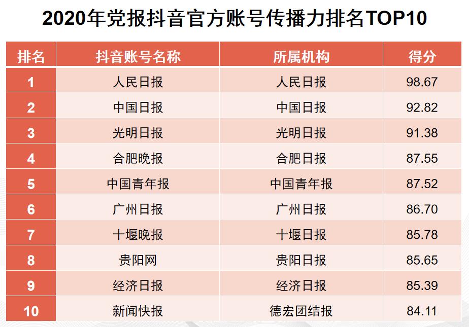 传播力排名前10的党报抖音号中,5个为中央级党报抖音号,5个是地市级党报抖音号,涌现出一批党报短视频新秀。