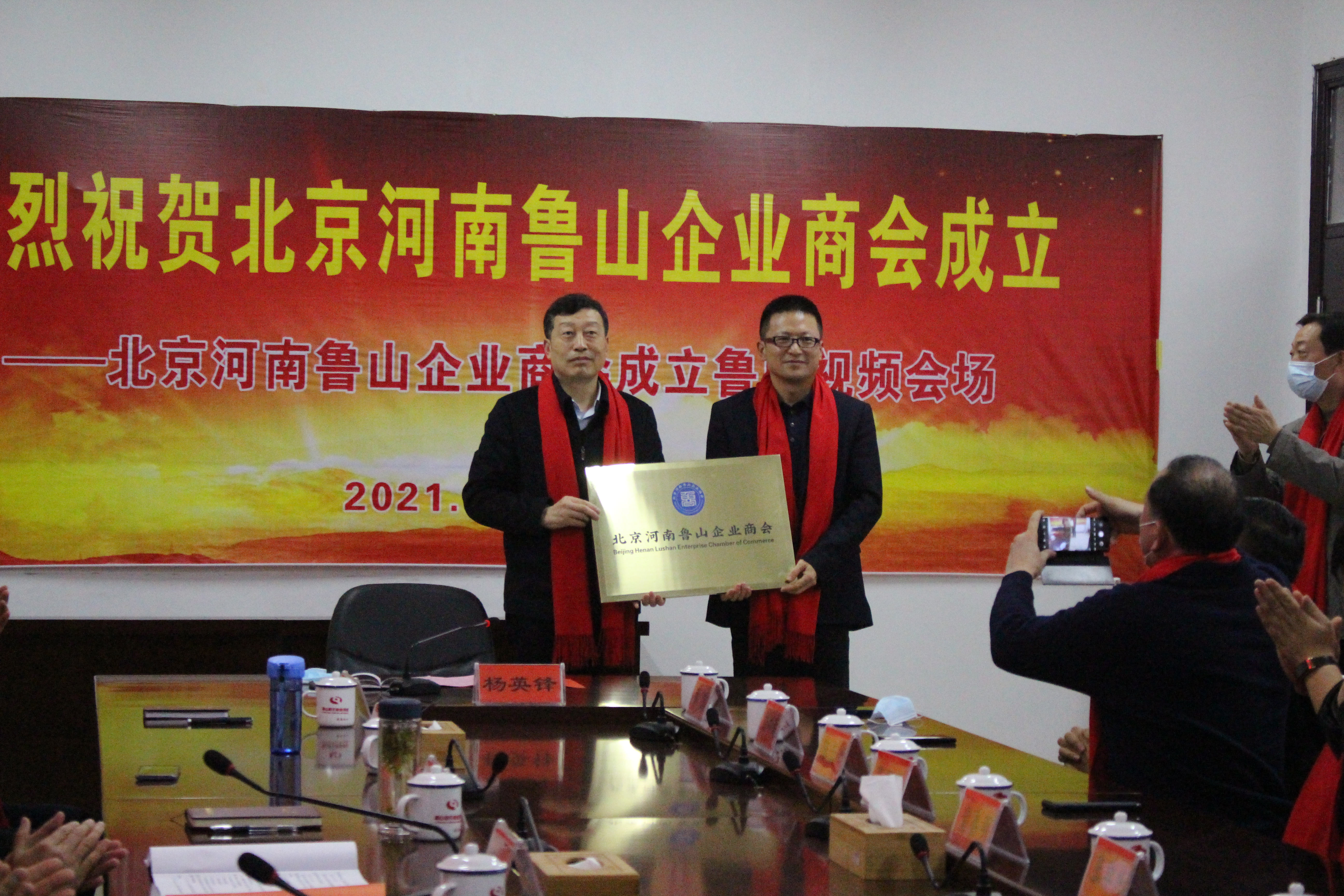 在鲁山分会场,平顶山市政协副主席、鲁山县委书记杨英锋向北京河南鲁山企业商会执行会长乔凯授北京河南鲁山企业商会会牌。