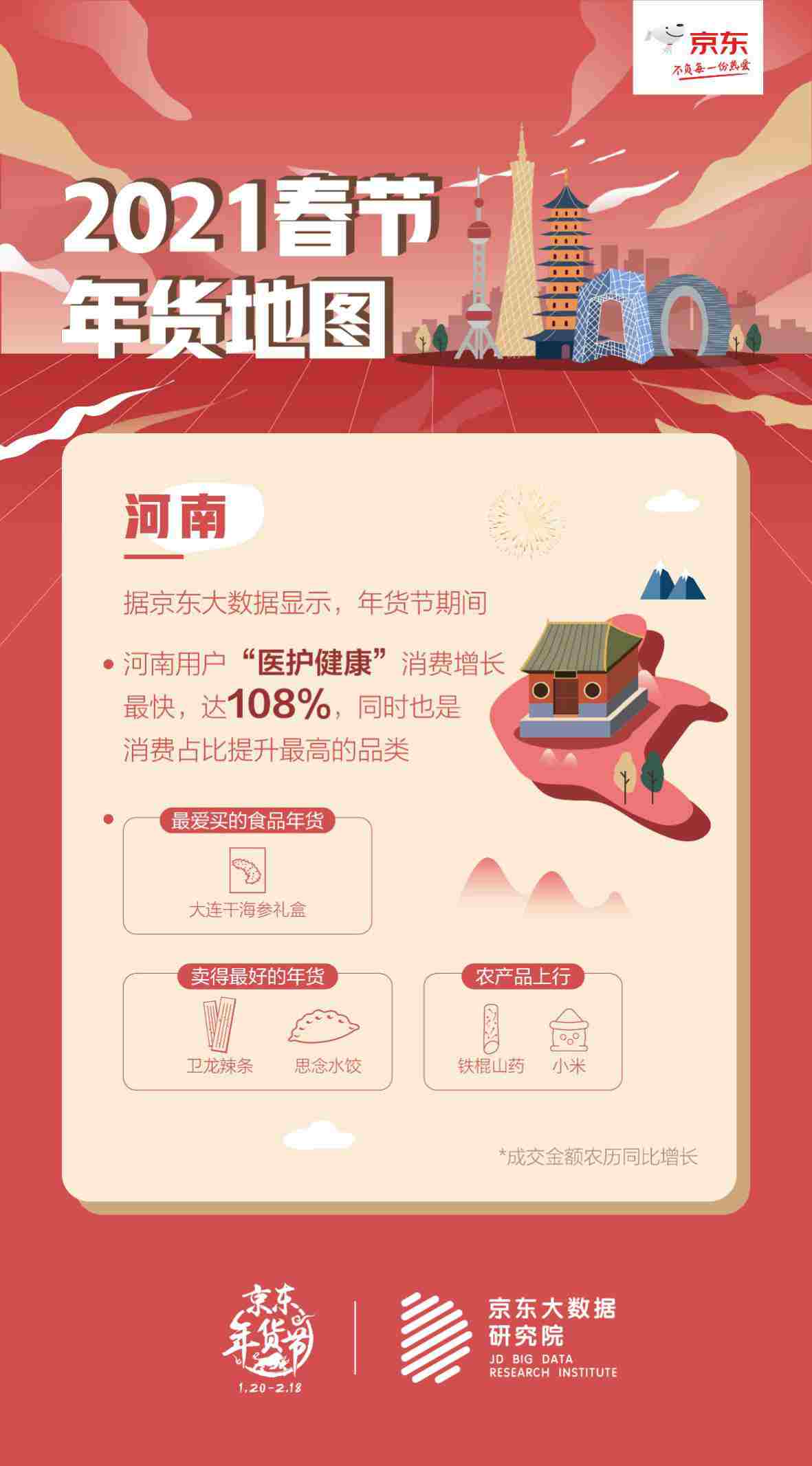 作为产粮大省,河南省近年来不断推动农产品上行,许多特色农产品赢得国人欢心。京东大数据显示,今年年货节,河南省农产品上行的代表选手是铁棍山药和小米。在销往外地的年货中,卖得最好的则是“河南之光”——卫龙辣条以及思念水饺。仔细品品河南的年货,不仅有年夜饭,还有零食、饺子,春节必备的几样都全了。当然,健康护理不能少,年货节期间河南用户对“医护健康”类产品消费增长高达108%。