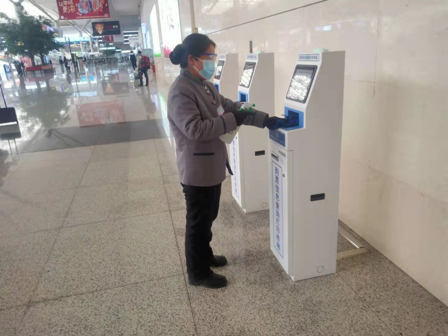 “按照消杀标准,我们也每天5次对车站公共区域进行消杀。”保洁经理朱建军说,白天以“抢点”消杀为主,在旅客出行分散的间隙,对座椅和卫生间、闸机等旅客高频使用区域消杀。晚上则结合深度保洁,对站区内的132部直梯、扶梯,5892个候车座椅,144个垃圾桶,240台检票闸机进行全方位集中擦拭、消毒。同时,在今年春运期间,还邀请蓝天救援队每周到站进行“地毯式、无死角”环境消杀作业。