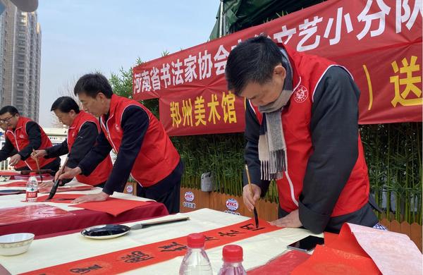 2月3日立春当日,郑州美术馆新馆举办“情聚郑美·福送万家”义写春联文化惠民活动,邀请郑州市书协、郑州市美协、郑州画院的10位书法家现场书写春联,逾300位观展群众收到了艺术家们现场亲笔书写的春联。郑州美术馆馆长罗鸣现场演示“福”字的写法,讲解“福”字的来历和意义,现场示范教学青少年儿童书写“福”字拿回家。2月10日,郑州画院艺术家联合郑州市美协、郑州市106中学共同组成文艺志愿者小分队,在郑州美术馆瑞达馆、郑州市地铁12号线施工工地等为留郑过年的施工工友书写近500余副春联和“福”字,并现场创作了多副务工人员肖像画,为古都郑州的传统佳节增添了浓郁而温暖的文化气息。