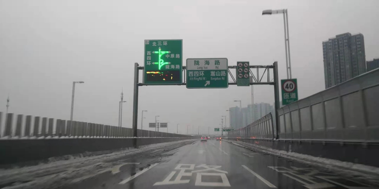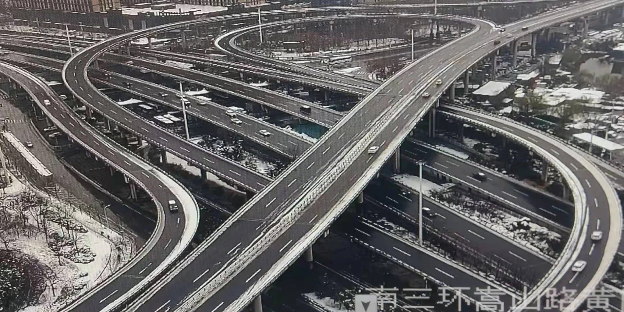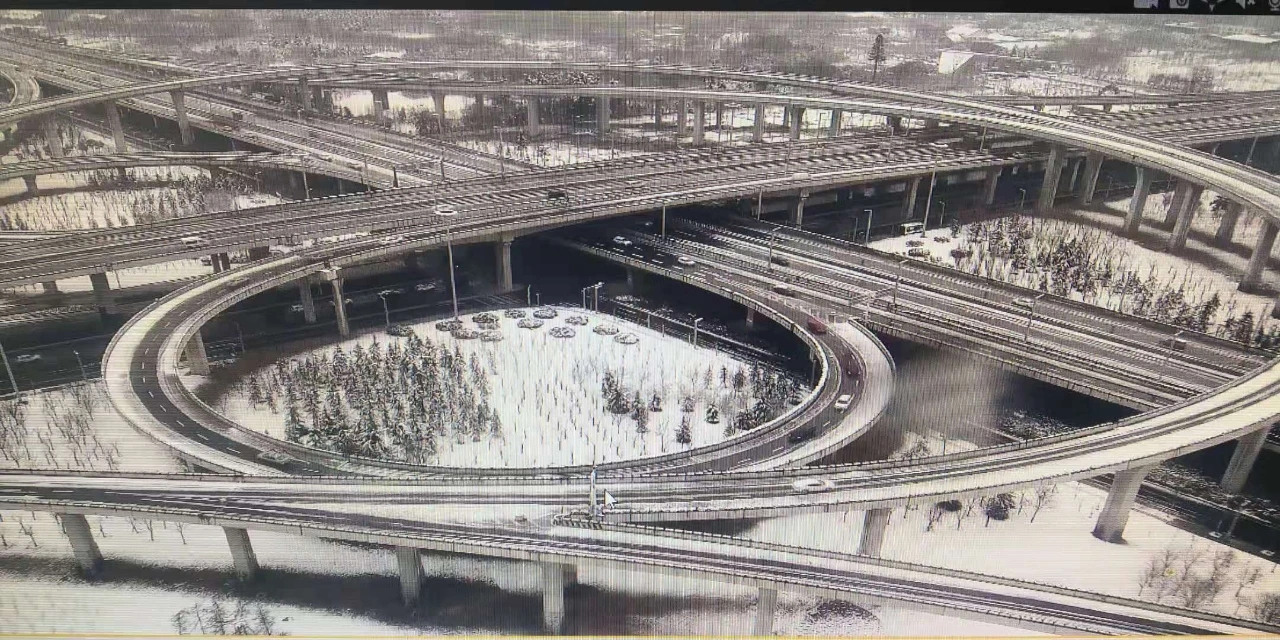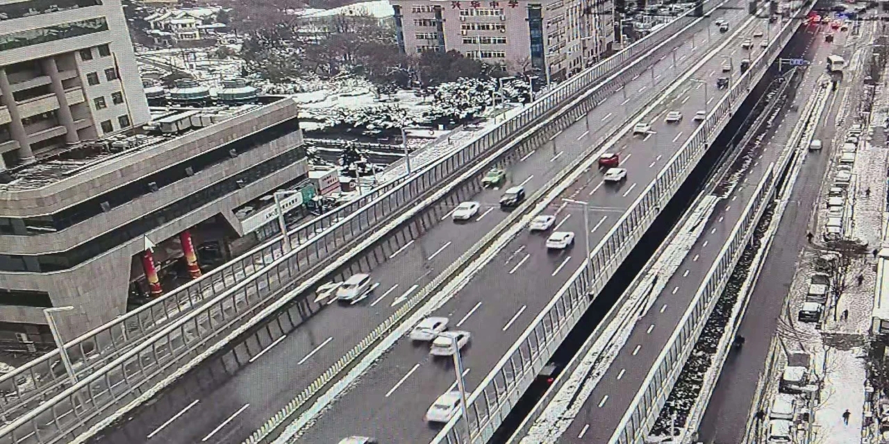 车流量小的高架路段,比地面道路积雪多一些,特别是匝道路段更需谨慎慢行。