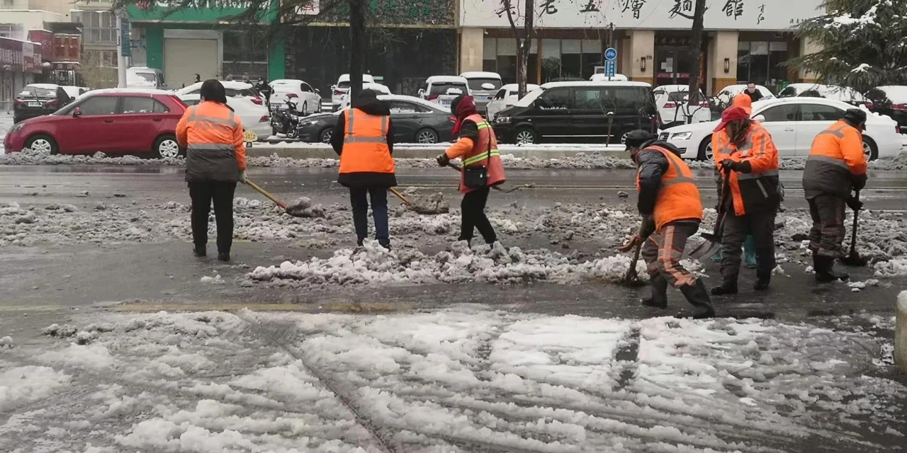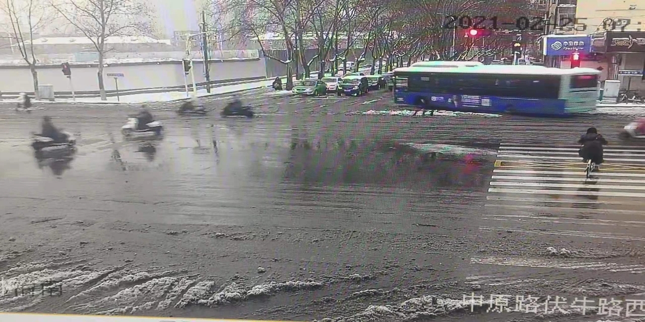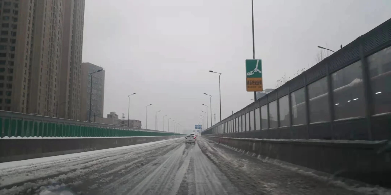 城市主干道,积雪并不严重,但仍有少量积雪,仍需降低车速,避让行人和非机动车。