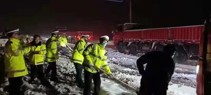 ·大雪致上百辆货车滞留341国道 安阳交警铁锹铲雪推车上坡3小时被困车辆全部解困