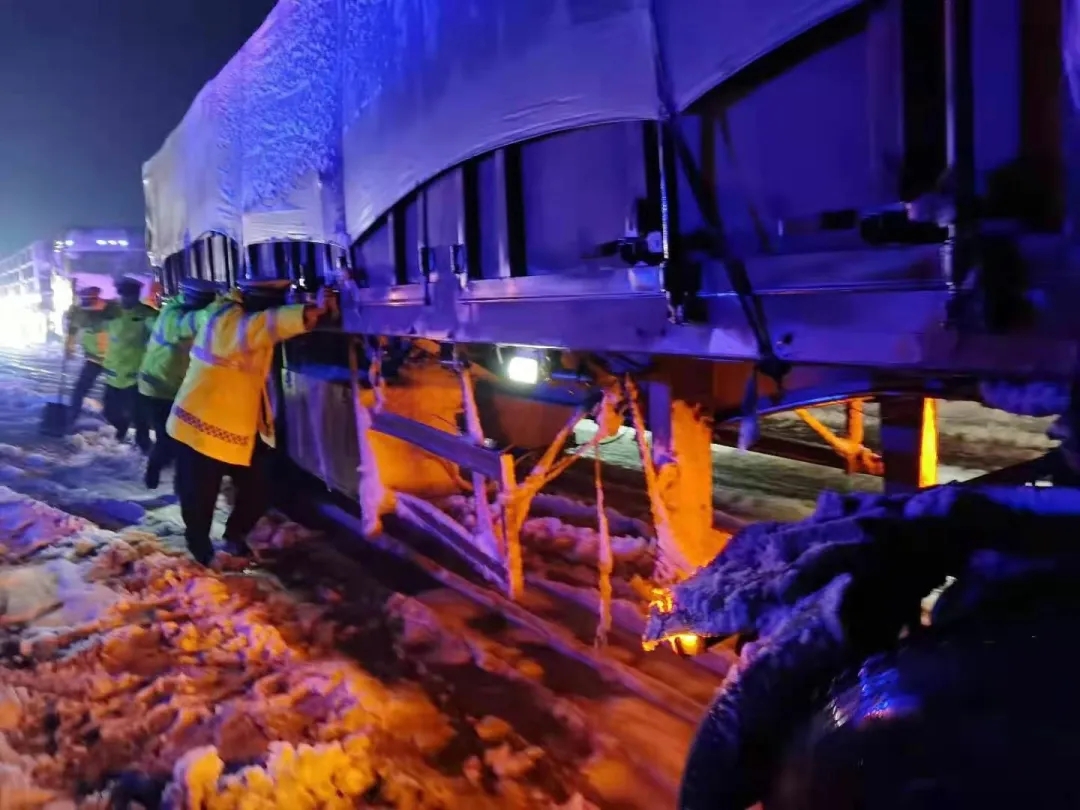当天23时许,341国道高白塔方向附近路段,因上坡路滑,上百辆货车滞留,在安阳交警支队龙安大队民警共同努力,通过铁锹除雪、帮助推车等方式,帮助车辆一一通过上坡路段。